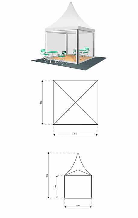 Dach- und Seitenplanen: weiß; PVC beschichtet; UV beständig und flammhemmend (DIN 4102 B1, M2; BS 5483/7837; USA NFPA701)