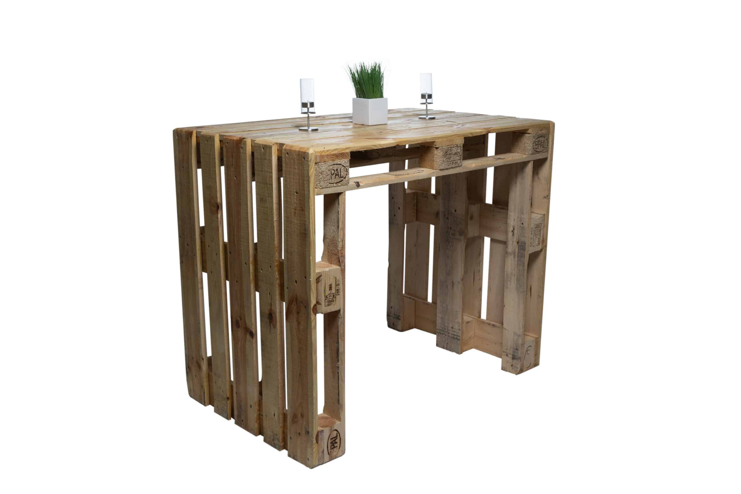 Unsere selbst gefertigten Paletten-Hochtische verleihen Ihrer Veranstaltung einen besonderen Charme. Durch verschiedene Kombinationen mit unseren Barhockern lassen sich die verschiedensten Stile erschaffen und verbinden. Geeignet sind unsere Palettenmöbel für den Einsatz im Innen- und Außenbereich.