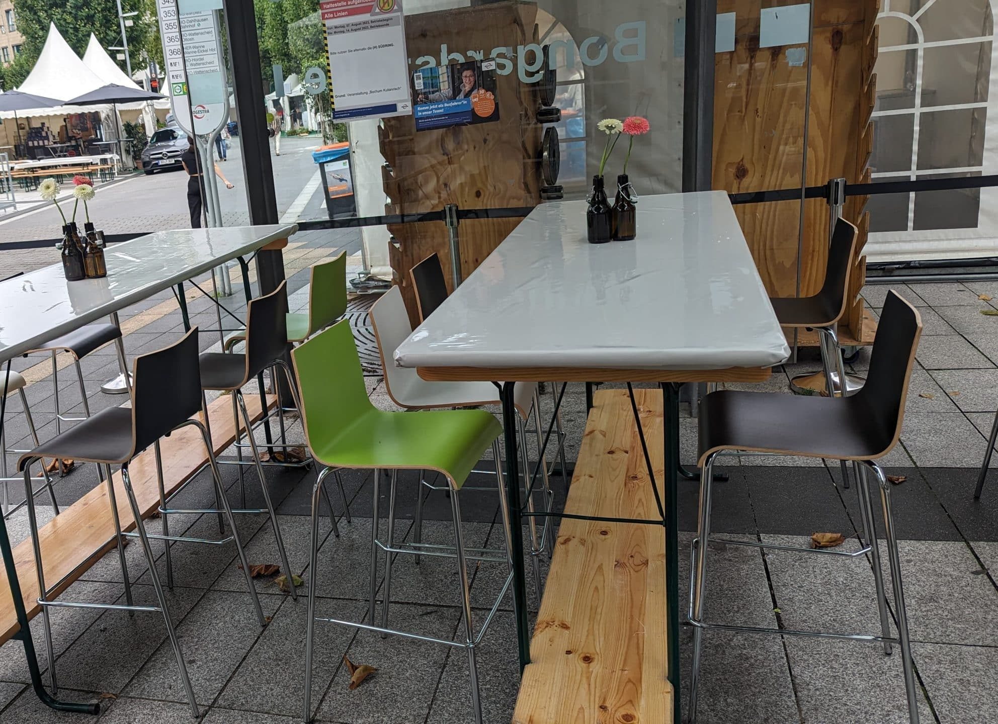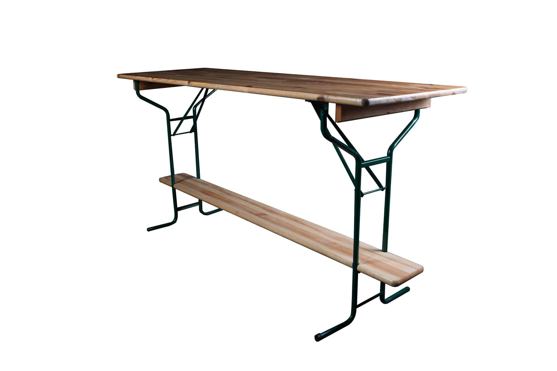 Dieser Stehtisch kombiniert charmantes Festzelttisch Design mit modernem Flair. Die Naturholzplatte sorgt für eine einladende Atmosphäre, während das grüne Stahlgestell Stabilität und Robustheit bietet.